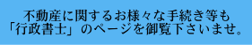 当事務所では、相続に関すること、不動産に関すること、行政手続きに関すること、各種許認可申請に関すること、様々な契約書の作成に関することについて、行政書士事務所と必要に応じ併設の宅地建物取引業者(不動産業)とのシームレス・ワンストップ連携により、お客様の「こうしたい」の実現に向けてお手伝いをさせていただいております。当事務所の行政書士は不動産業界歴35年超で現役の宅地建物取引士も務めておりますので、不動産に関する各種手続きにも精通しております。詳細につきましては、画面左「行政書士」「不動産」をクリックして下さい。