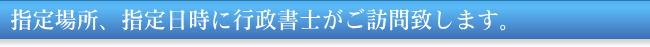 平日や昼間時間帯は、お仕事や家事都合でご来所が難しいといった場合には、ご相談下さい。あらかじめご連絡いただいたうえで日時や場所等を調整し、行政書士がご自宅やお勤め先、お近くのカフェなどにお伺い致します。(相談・打合せ・書類への押印・関連書類のお預かり・成果品(許可証等)のお渡しなど)