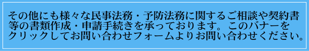 妻や夫、子、孫に資産を贈与したい(暦年贈与の活用)。ご近所などの個人間や親族間などの不動産売買契約書、賃貸借契約書を作成したい。隣地との土地境界の覚書を作っておきたい。大工さんや工務店さんとの請負契約書を作成したい。不動産や金銭の贈与契約書を作成したい。お金の貸し借りに関して金銭消費貸借契約書を作成したい。債権を譲渡したい。離婚するので離婚協議書を作成したい。事故や取引、お互いの契約関係などの和解契約書を作成したいなど。 又、県内外の宅地建物取引業者様からの、物件調査、重要事項説明書や売買契約書等の原案(ドラフト)作成に関するご依頼や、法律事務所様からの物件調査、実勢価格調査も承っております。 |